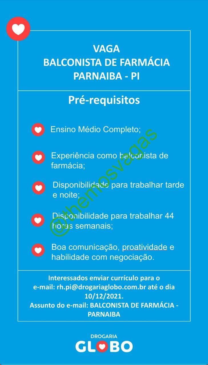 – Interessados(as) e que atendam ao perfil solicitado acima, devem enviar o currículo até 10/12/2021 para o e-mail rh.pi@drogariaglobo.com.br, contendo no título/assunto “Balconista de Farmácia – Parnaíba“.