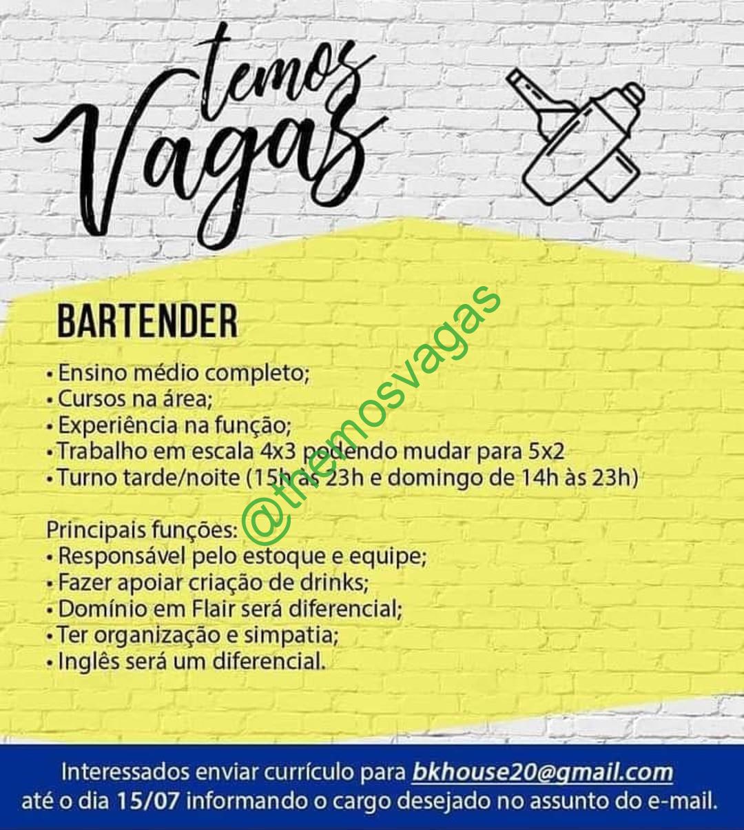 – Interessados(as) e que atendam ao perfil solicitado acima, devem enviar o currículo até 15|07|2021 para o e-mail bkhouse20@gmail.com, contendo no titulo/assunto “Bartender – FOR”
