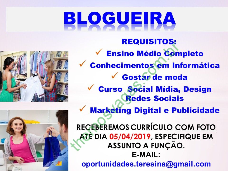 Interessados(as) e que atendam aos requisitos devem enviar o perfil profissional com foto até o dia 05/04/2019, colocando no título do e-mail “Blogueira”, para: oportunidades.teresina@gmail.com