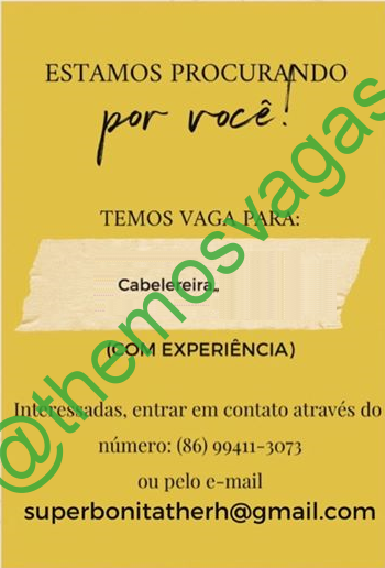 – Interessados(as) e que atendam ao perfil solicitado acima, devem enviar o currículo para o e-mail superbonitatherh@gmail.com , colocando no título/assunto “Cabeleireira”.