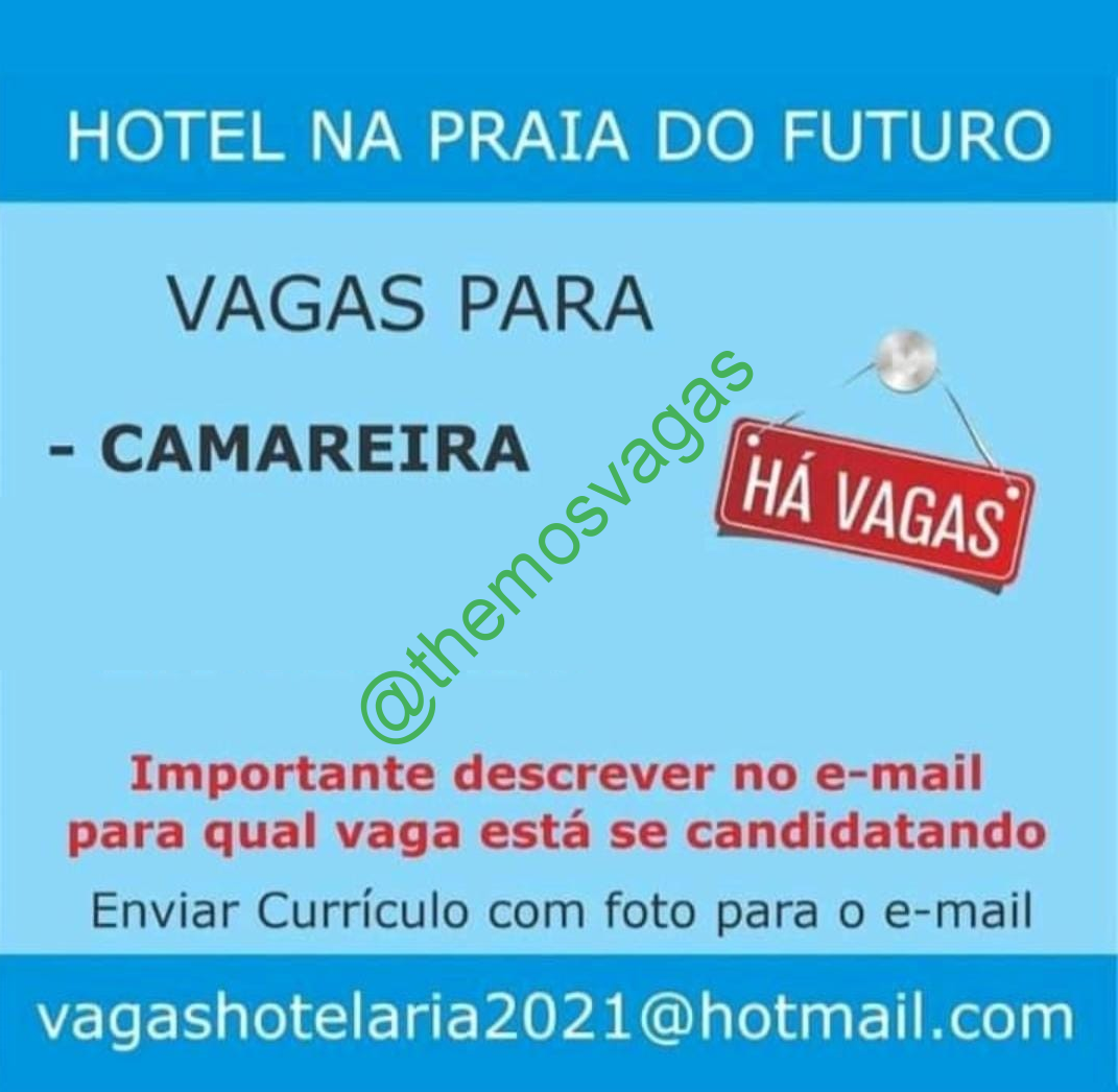 – Interessados(as) e que atendam ao perfil solicitado acima, devem enviar o currículo para o e-mail vagashotelaria2021@hotmail.com, contendo no titulo/assunto “Camareira – FOR