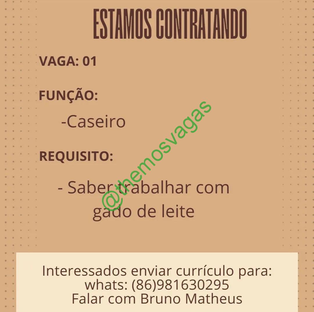 – Interessados(as) e que atendam ao perfil solicitado acima, devem enviar o currículo través do whatsapp 86 8163-02958163-0295 informando para Bruno Matheus que pretende concorrer para a vaga de  “Caseiro”  .