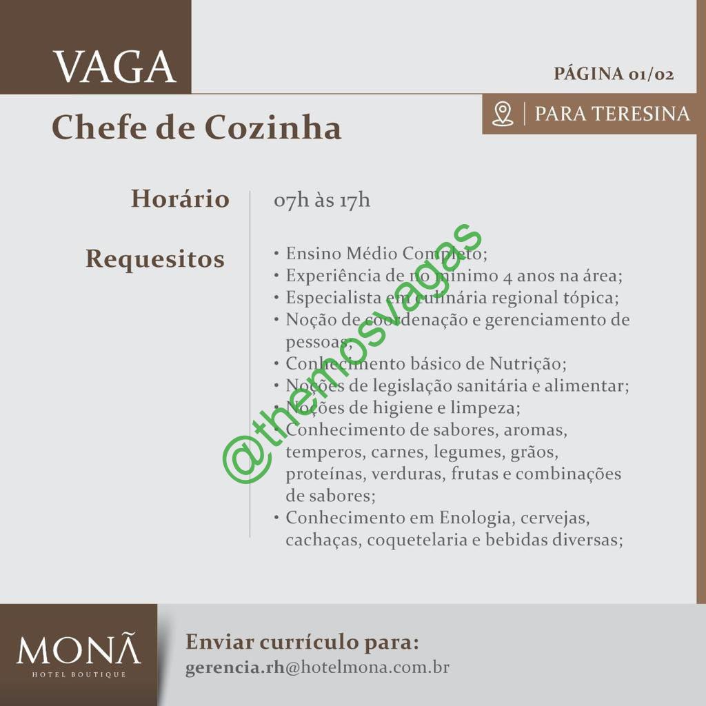 – Interessados(as) e que atendam ao perfil solicitado acima, devem enviar o currículo para o e-mail gerencia.rh@hotelmona.com.br contendo no título/assunto “Chefe de Cozinha – THE“.