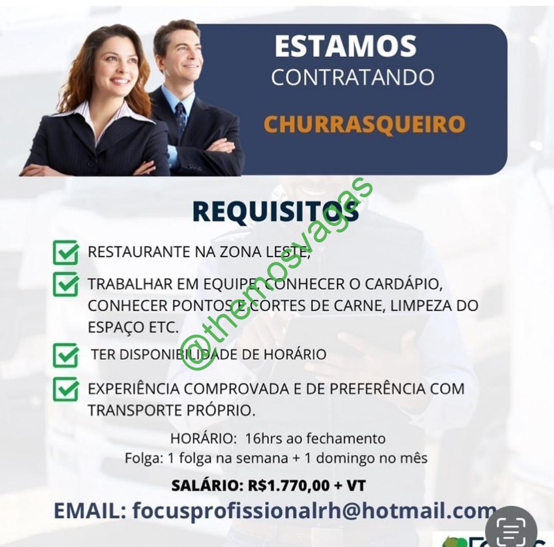 – Interessados(as) e que atendam ao perfil solicitado acima, devem enviar o currículo para o e-mail focusprofissionalrh@hotmail.com contendo no título/assunto “Churrasqueiro – THE“.