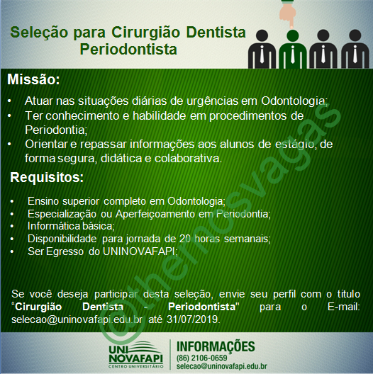 – Interessados(as) e que atendam ao perfil solicitado acima, devem enviar o currículo até 31/07/2019 para o e-mail selecao@uninovafapi.edu.br contendo no título/assunto “Cirurgião Dentista – Periodontista”.