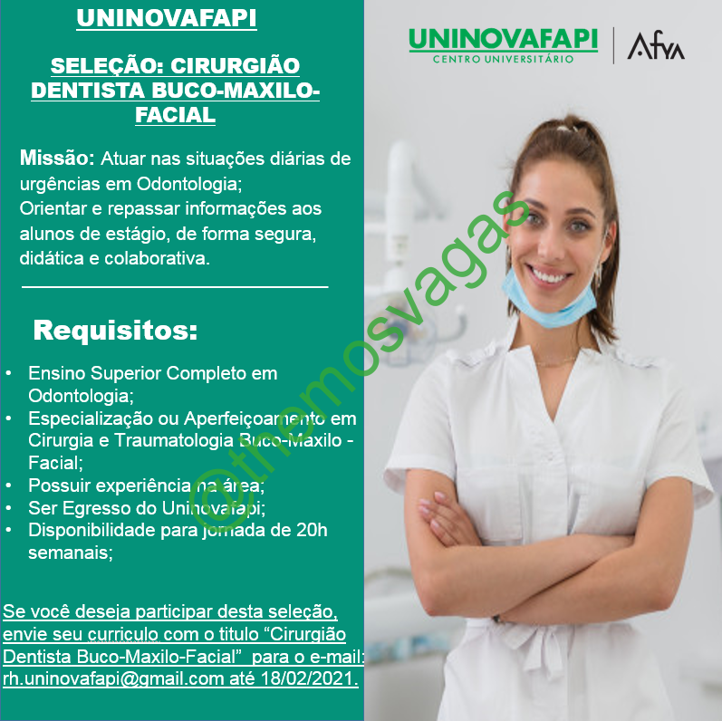 – Interessados(as) e que atendam ao perfil solicitado acima, devem enviar o currículo até 18/02/2021 para o e-mail rh.uninovafapi@gmail.com contendo no título/assunto “Cirurgião Dentista Buco-Maxilo- Facial”