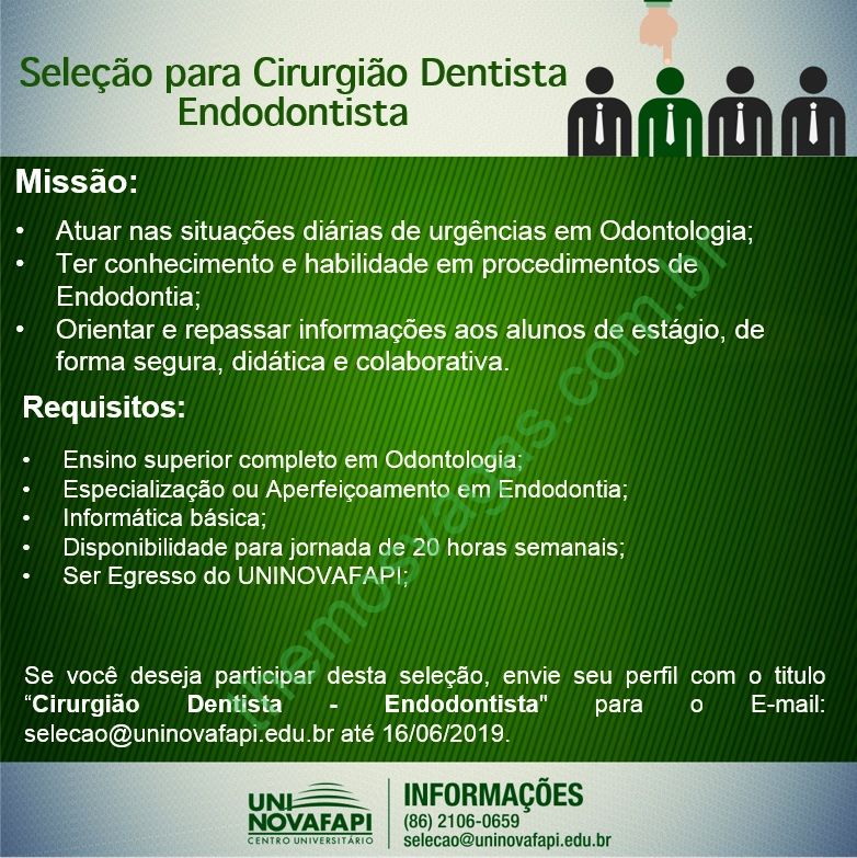 – Interessados(as) e que atendam aos requisitos devem enviar o perfil profissional até o dia 16/06/2019, colocando no título do e-mail “Cirurgião Dentista – Endodontista”, para:  selecao@uninovafapi.edu.br