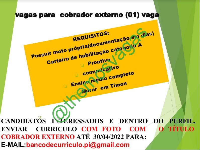 – Interessados(as) e que atendam ao perfil solicitado acima, devem enviar o currículo com foto até 30/04/2022  para o e-mail bancodecurriculo.pi@gmail.com contendo no título/assunto “Cobrador Externo
