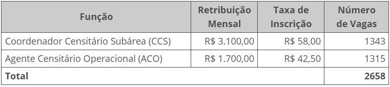 As remunerações mensais previstas são de R$ 3.100,00 para Coordenador Censitário Subárea (CCS) e de R$ 1.700,00 para Agente Censitário Operacional (ACO). Os candidatos a Coordenador Censitário Subárea (CCS) devem ter nível superior em qualquer área de conhecimento e Carteira Nacional de Habilitação definitiva ou provisória, dentro do prazo de validade, no mínimo para a categoria B. A função de Agente Censitário Operacional (ACO) exige escolaridade de nível médio.