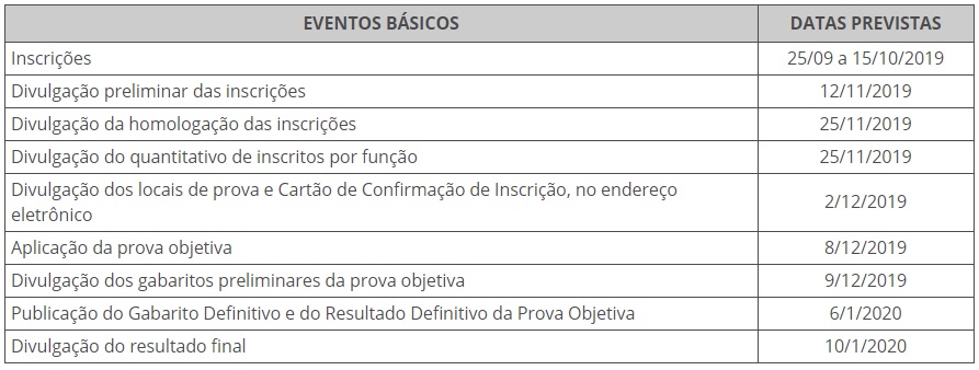 O cronograma completo do processo seletivo está no edital e deve ser lido atentamente pelos candidatos. As principais etapas estão resumidas na tabela a seguir: