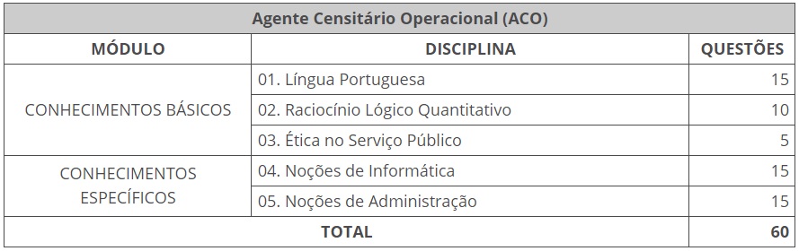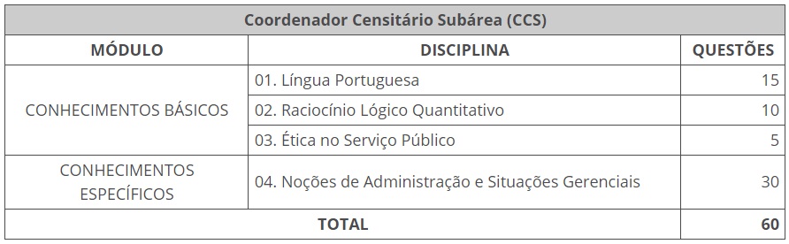 As provas estão previstas para 8 de dezembro e serão realizadas nos 1.031 municípios onde são oferecidas vagas para Coordenador Censitário Subárea (CCS). Para ambas as funções, as provas terão 60 questões objetivas, divididas em dois módulos, de conhecimentos básicos e específicos. O módulo básico tem três disciplinas: Língua Portuguesa, Raciocínio Lógico Quantitativo e Ética no Serviço Público. Já o módulo de Conhecimentos Específicos tem a disciplina de Noções de Administração e Situações Gerenciais, para a função CCS, e as disciplinas de Noções de Informática e Noções de Administração para a função ACO, como mostra a tabela a seguir.