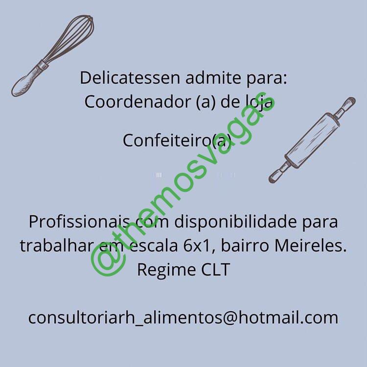 – Interessados(as) e que atendam ao perfil solicitado acima, devem enviar o currículo para o e-mail consultoriarh_alimentos@hotmail.com, contendo no titulo/assunto “Confeiteiro – FOR”.