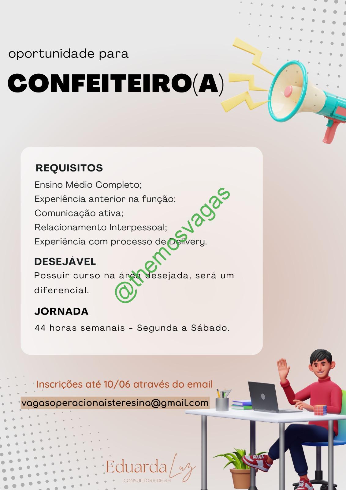 – Interessados(as) e que atendam ao perfil solicitado acima, devem enviar o currículo até 10/06/2023 para o e-mail vagasoperacionaisteresina@gmail.com contendo no título/assunto “Confeiteiro(a) – THE“.