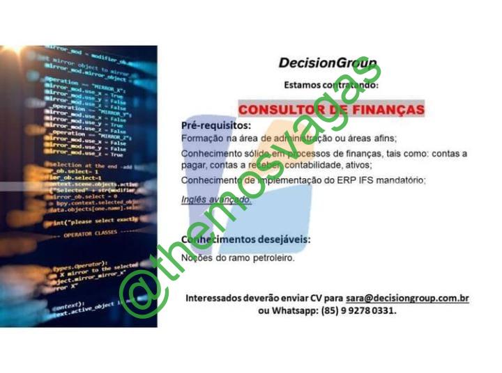 –  Interessados(as) e que atendam ao perfil solicitado acima, devem enviar o currículo para o e-mail sara@decisiongroup.com.br, contendo no título/assunto “Consultor de Finanças – FOR”.