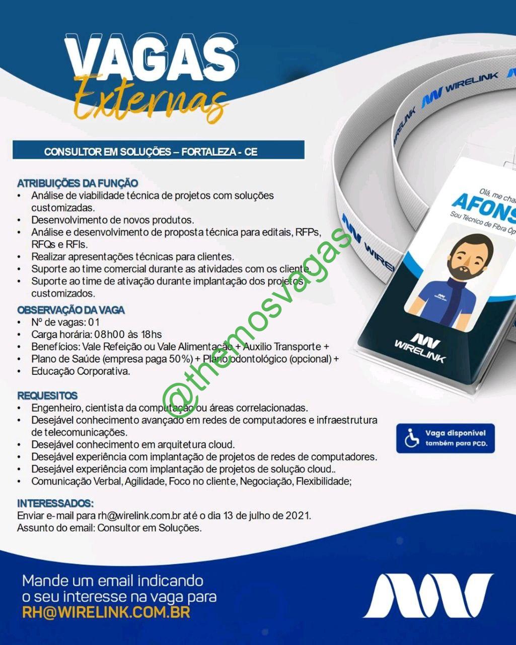 – Interessados(as) e que atendam ao perfil solicitado acima, devem enviar o currículo para o e-mail rh@wirelink.com.br, contendo no titulo/assunto “Consultor de Soluções – FOR”
