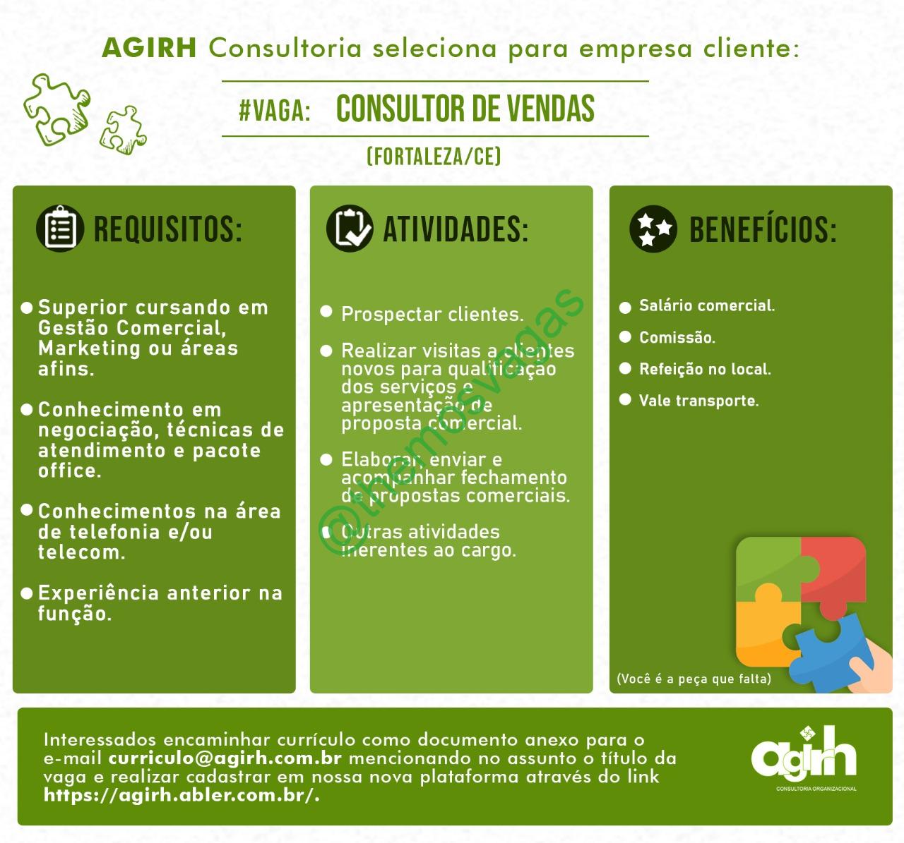 – Interessados(as) e que atendam ao perfil solicitado acima, devem enviar o currículo para o e-mail curriculo@agirh.com.br, contendo no titulo/assunto “Consultor de Vendas – FOR” e se cadastrar na plataforma de cadastro do site.