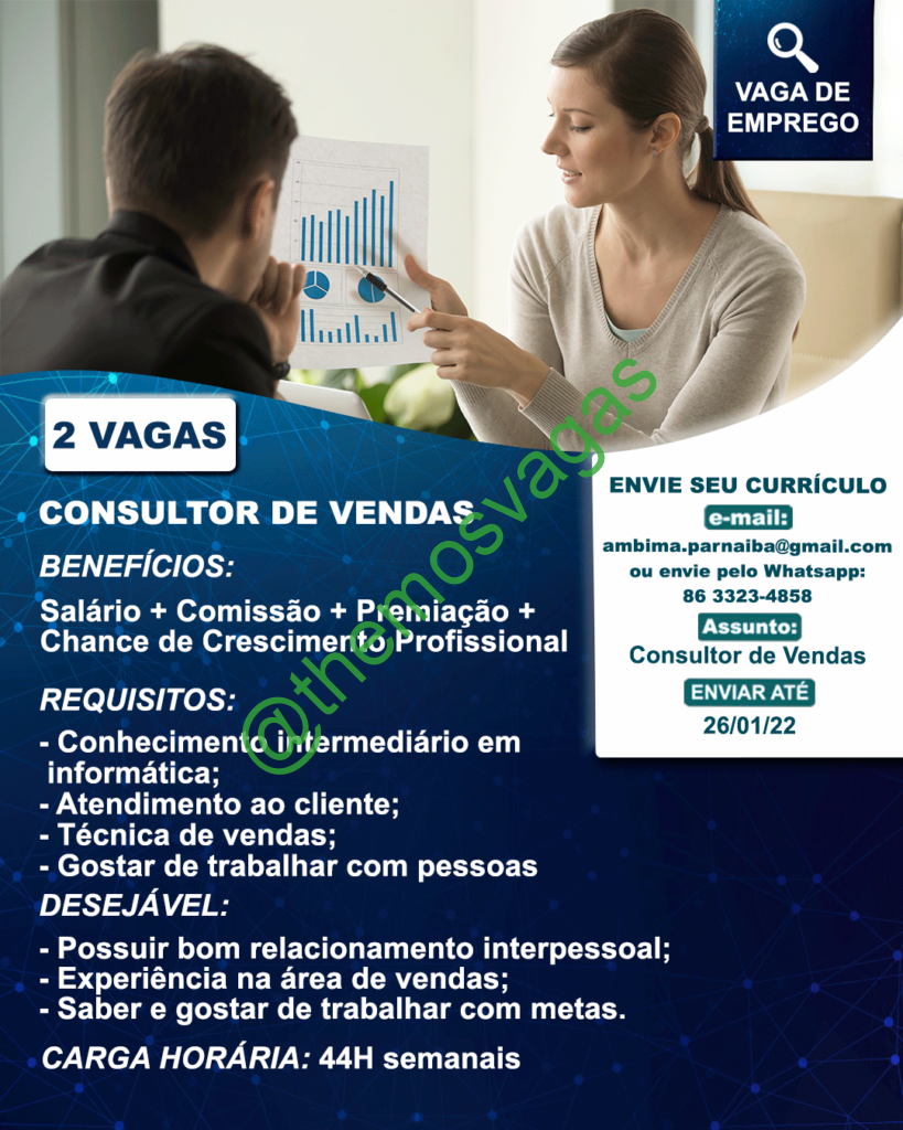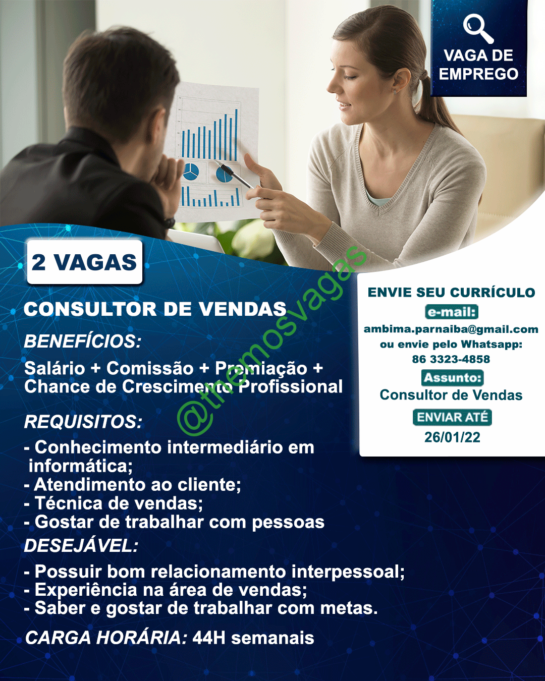 – Interessados(as) e que atendam ao perfil solicitado acima, devem enviar o currículo até 26/01/2022  para o e-mail ambima.parnaiba@gmail.com  contendo no título/assunto “Consultor de Vendas” ou através do telefone/whats 86 33234858 .