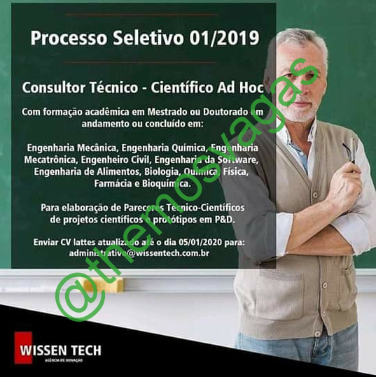 – Interessados(as) e que atendam ao perfil solicitado acima, devem até o dia 05/01/2020 enviar o currículo Lates atualizado para o e-mail administrativo@wissentech.com.br , colocando no título “CONSULTOR TÉCNICO CIENTÍFICO AD HOC”.