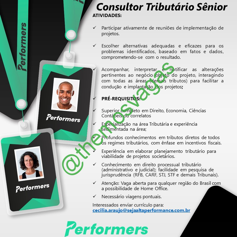 – Interessados(as) e que atendam ao perfil solicitado acima, devem enviar o currículo para o e-mail cecilia.araujo@sejaaltaperformace.com.br com o titulo/assunto “Consultor Tributário – FOR