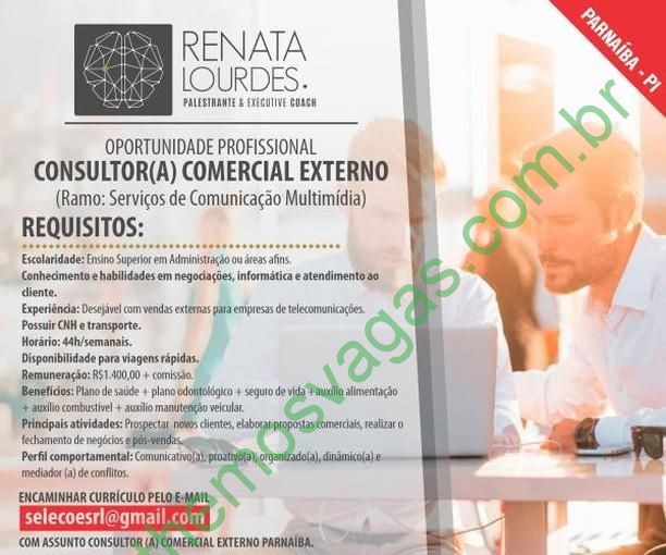 – Interessados(as) e que atendam aos requisitos devem enviar o perfil profissional, colocando no título do e-mail “Consultor(a) Comercial Externo Parnaíba”, para: selecoesrl@gmail.com