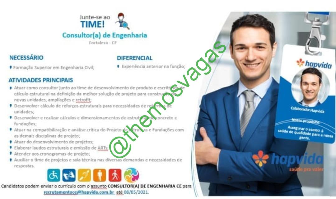 – Interessados(as) e que atendam ao perfil solicitado acima, devem enviar o currículo até 08|05|2021 para o e-mail recrutamentoce@hapvida.com.br, contendo no título/assunto “Consultor(a) de Engenharia – FOR”.