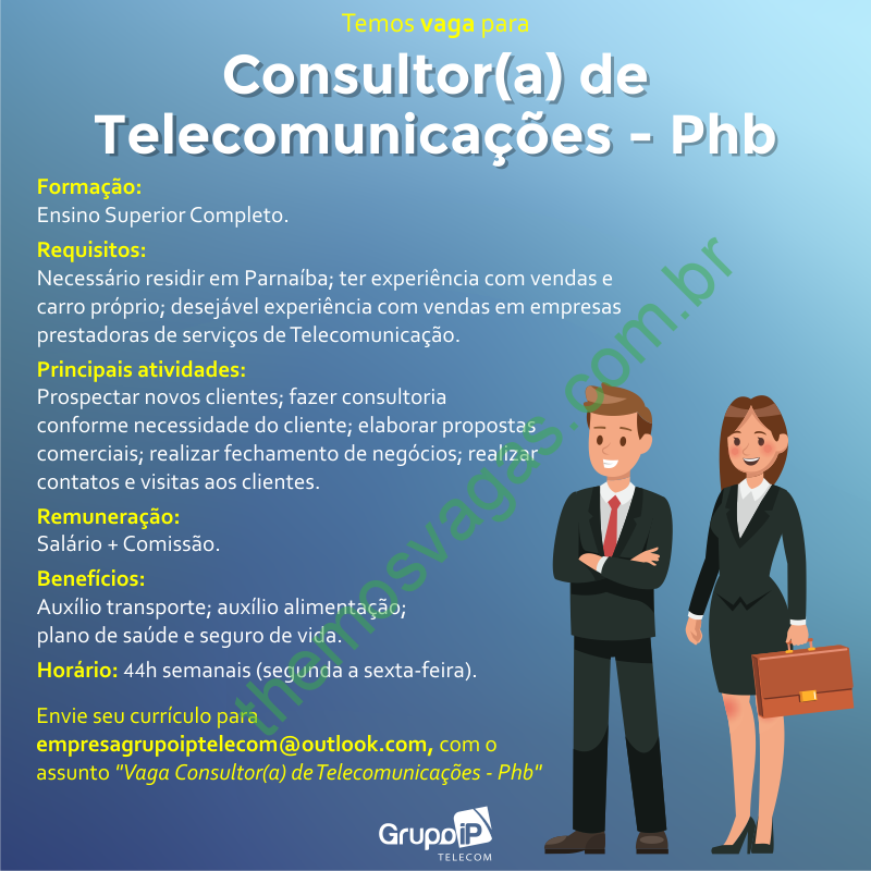 Interessados(as) e que atendam aos requisitos devem enviar o perfil profissional, colocando no título do e-mail “Vaga Consultor(a) de Telecomunicações – Phb”, para: empresagrupoiptelecom@outlook.com