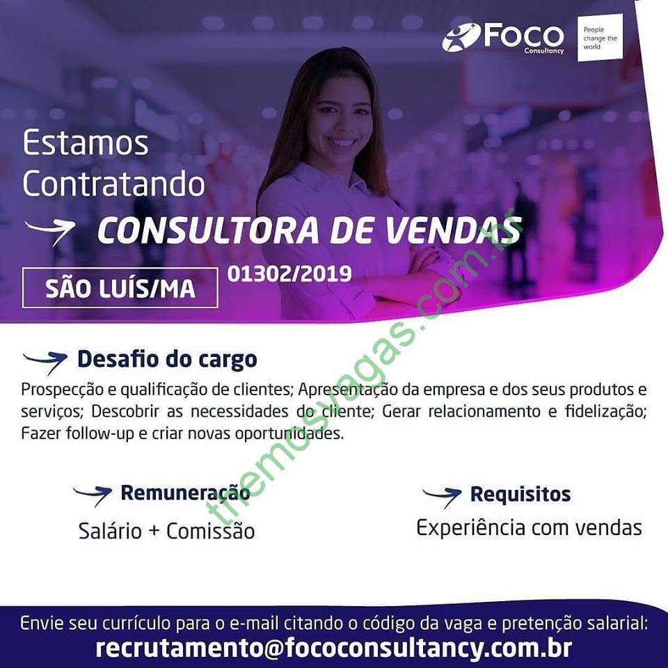 Interessados(as) e que atendam aos requisitos devem enviar o perfil profissional e pretensão salarial para: recrutamento@fococonsultancy.com.br usando o código 01302/2019