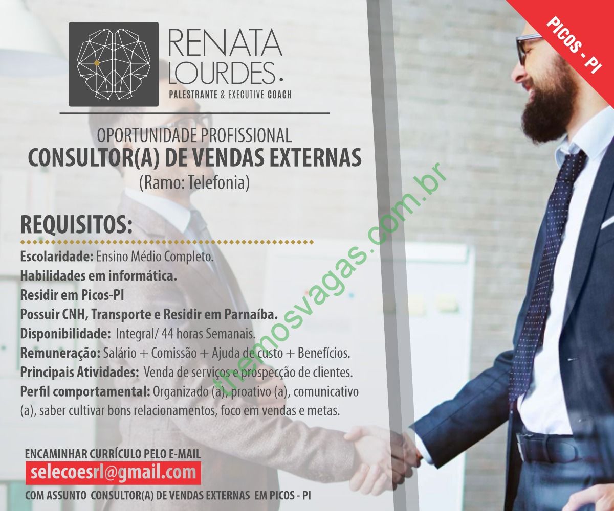 – Interessados(as) e que atendam aos requisitos devem enviar o perfil profissional, colocando no título do e-mail “Consultor(a) de Vendas Externas – Picos”, para: selecoesrl@gmail.com