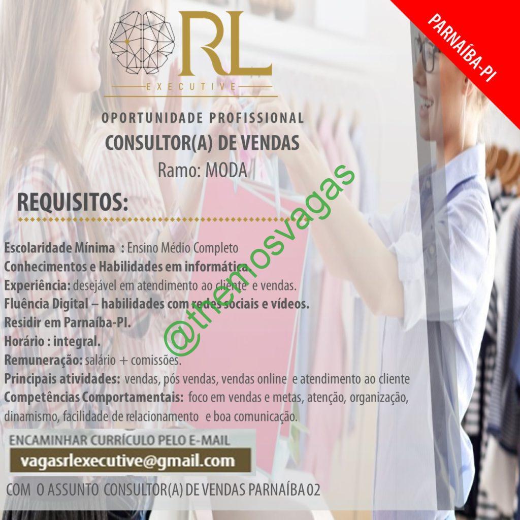 – Interessados(as) e que atendam ao perfil solicitado acima, devem enviar o currículo para o e-mail vagasrlexecutive@gmail.com contendo no título/assunto “Consultor(a)de Vendas  Parnaíba 02