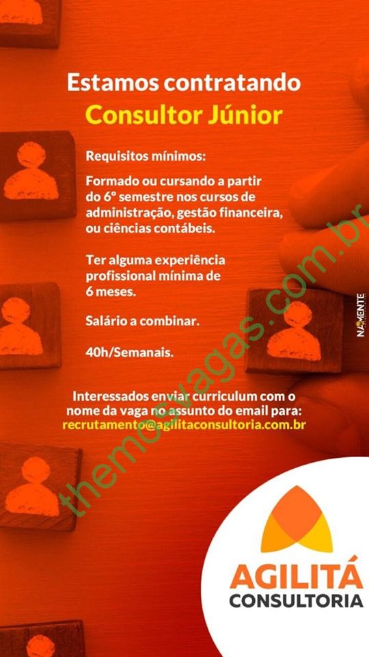 – Interessados(as) e que atendam ao perfil solicitado acima, devem enviar o currículo para o e-mail recrutamento@agilitaconsultoria.com.br , colocando no título “Consultor(a) Júnior”.