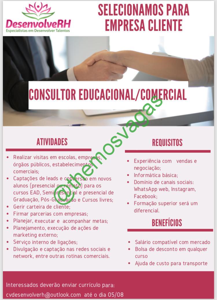 – Interessados que atendam ao perfil, favor encaminhar o currículo até o dia 05/08 para o e-mail cvdesenvolverrh@outlook.com com o titulo/assunto “Consultor Educacional – FOR“.