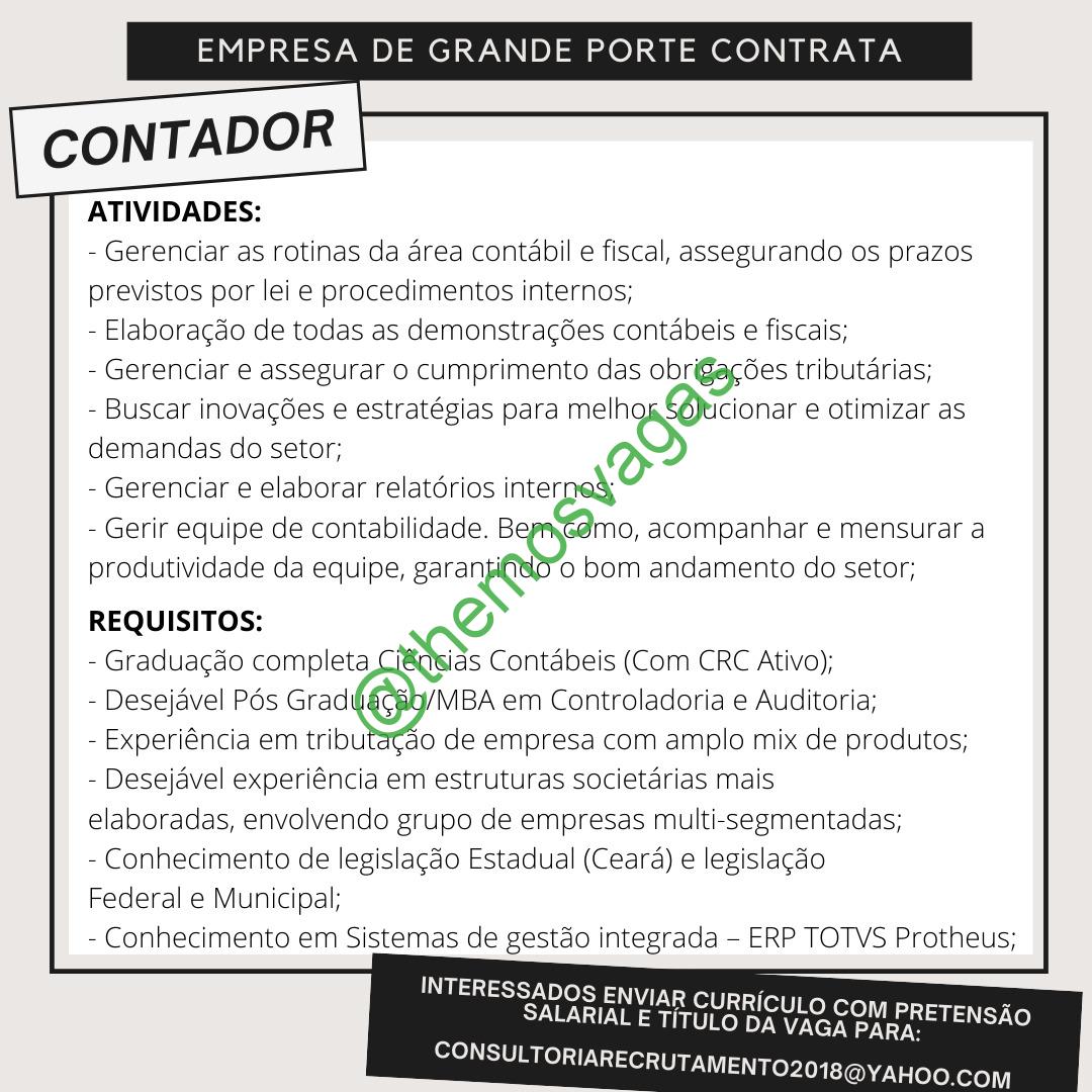 – Interessados(as) e que atendam ao perfil solicitado acima, devem enviar o currículo para o e-mail consultoriarecrutamento2018@yahoo.com contendo no título/assunto “Contador – FOR