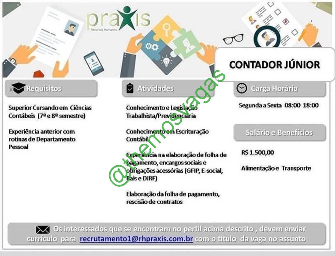 – Interessados(as) e que atendam ao perfil solicitado acima, devem enviar o currículo para o e-mail recrutamento1@rhpraxis.com.br, contendo no titulo/assunto “Contador Júnior – FOR