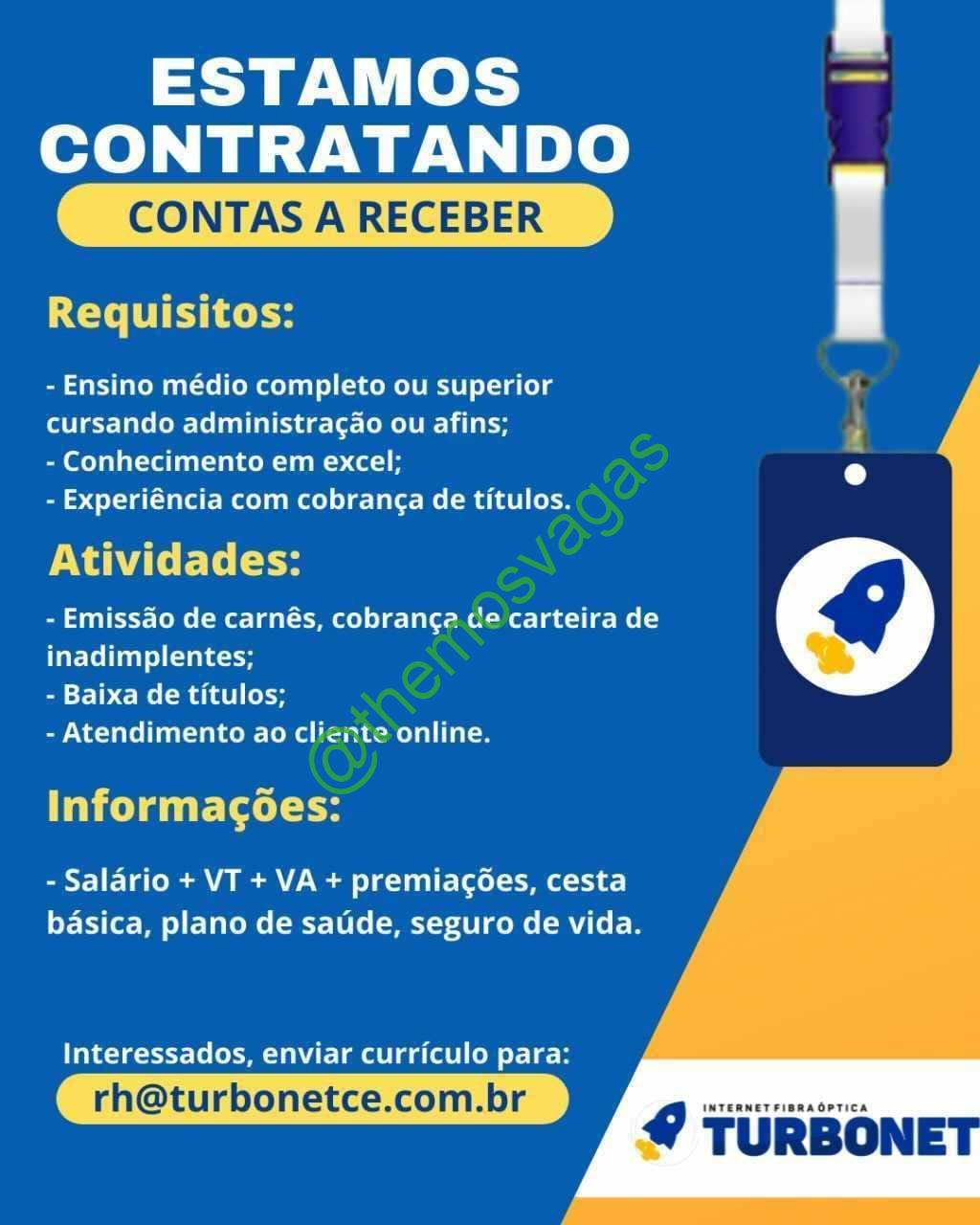 – Interessados(as) e que atendam ao perfil solicitado acima, devem enviar o currículo para o e-mail rh@turbonetce.com.br, contendo no titulo/assunto “Contas a Receber – FOR