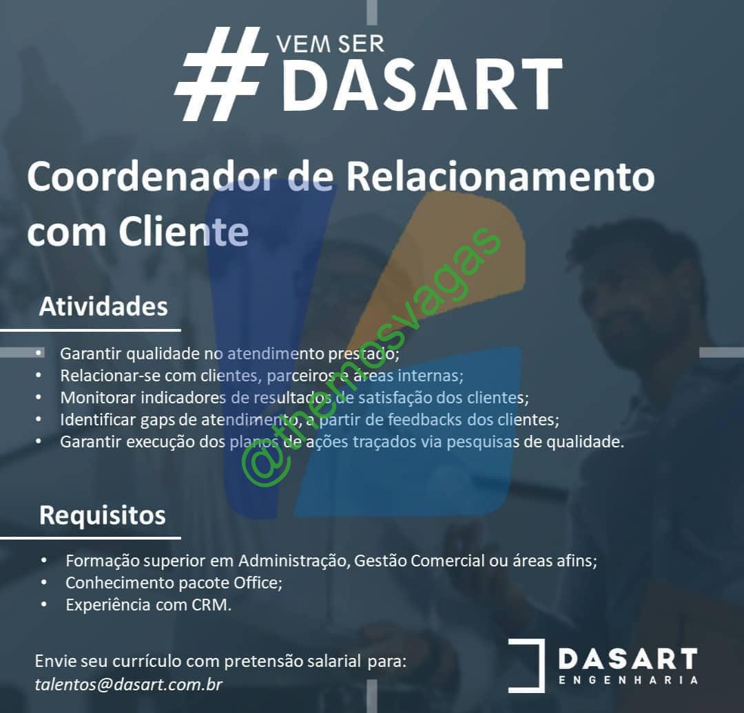 – Interessados(as) e que atendam ao perfil solicitado acima, devem enviar o currículo para o e-mail talentos@dasart.com.br contendo no título/assunto “Coordenador(a) de Relacionamento com Cliente – FOR“.
