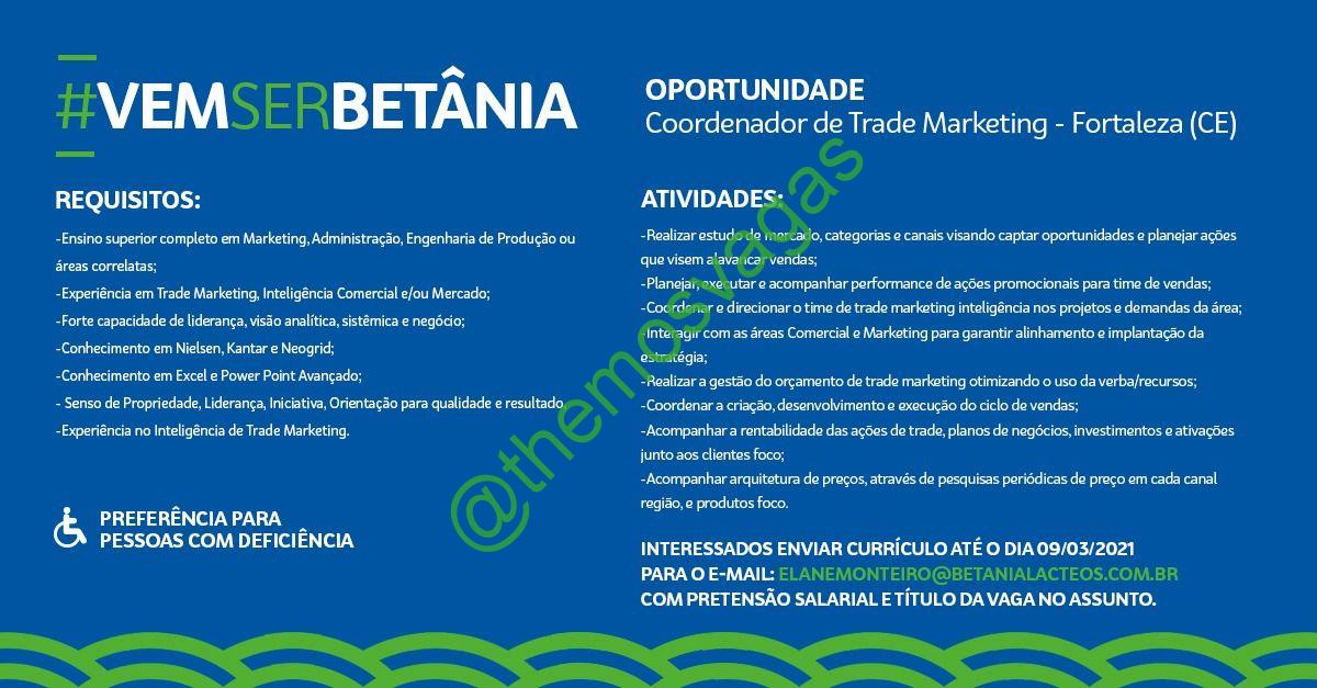 – Interessados(as) e que atendam ao perfil solicitado acima, devem enviar o currículo com pretenção salarial para e-mail elanemonteiro@betanialacteos.com.br contendo no titulo/assunto “Coord de Trade Marketing – FOR”.
