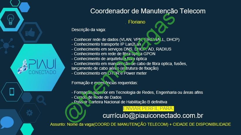 – Interessados(as) e que atendam ao perfil solicitado acima, devem enviar o currículo até 05/02/2020 para o e-mail curriculo@piauiconectado.com.br contendo no título/assunto “Coordenador de Manutenção Floriano