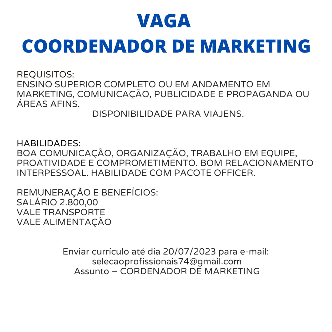 – Interessados(as) e que atendam ao perfil solicitado acima, devem enviar o currículo até 20/07/2023 para o e-mail selecaoprofissionais74@gmail.com contendo no título/assunto “Coordenador de Marketing“.