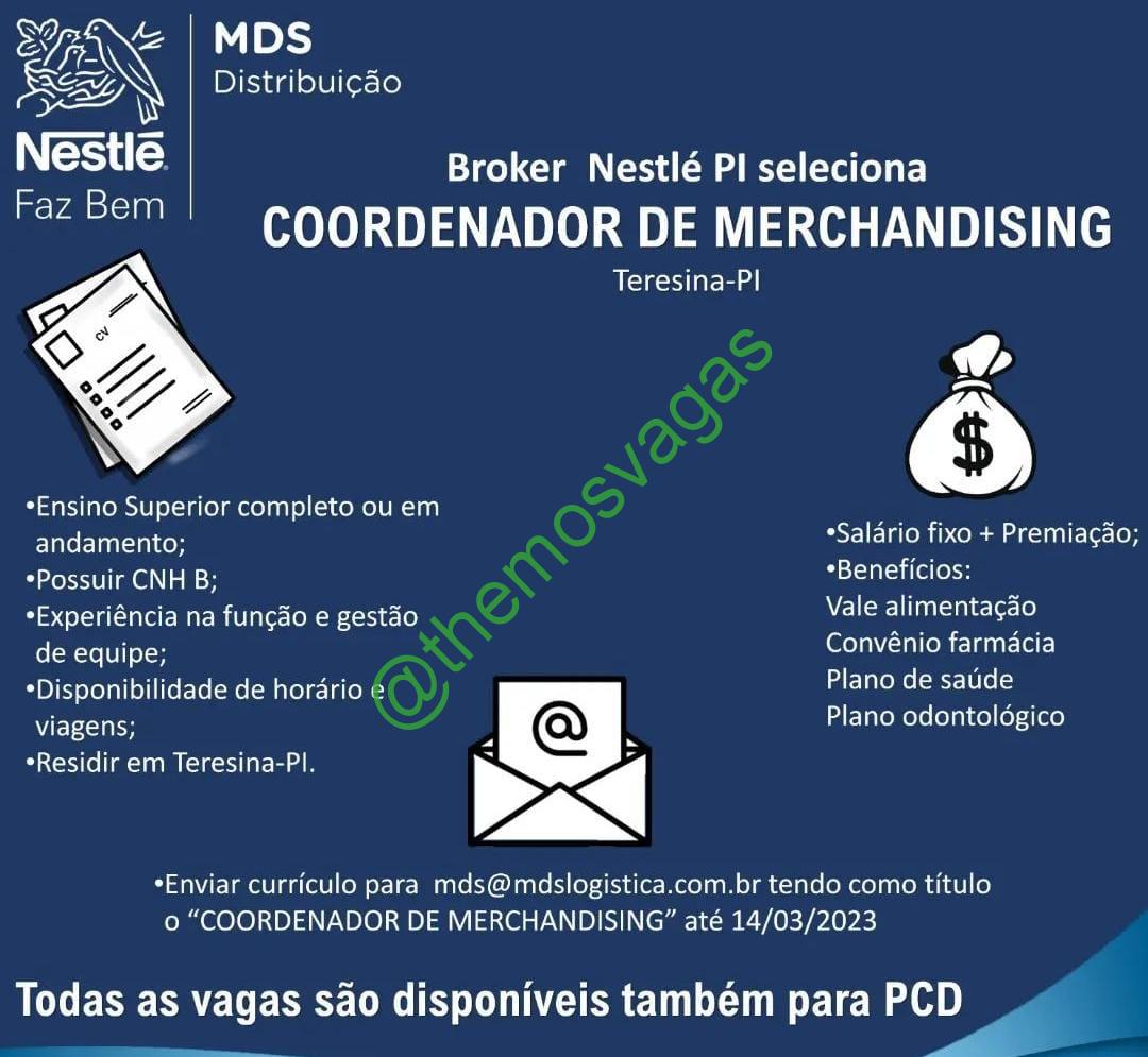 – Interessados(as) e que atendam ao perfil solicitado acima, devem enviar o currículo até 14/03/2023 para o e-mail mds@mdslogistica.com.br contendo no título/assunto “Coordenador de Merchandising