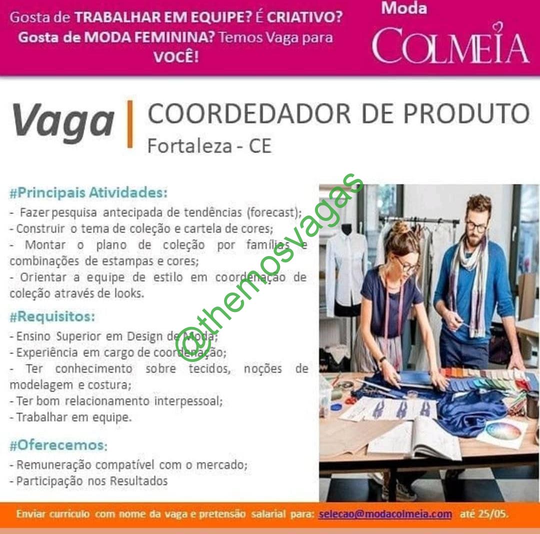 –  Interessados(as) e que atendam ao perfil solicitado acima, devem enviar o currículo até 25/05/2021 para o e-mail selecao@modacolmeia.com, contendo no título/assunto “Coordenador de Produto – FOR“.
