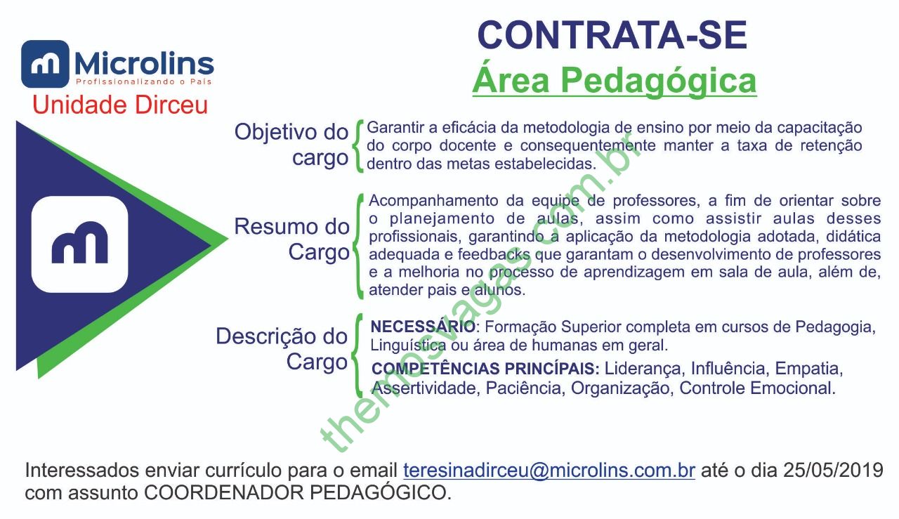 – Interessados(as) e que atendam aos requisitos devem enviar o perfil profissional até o dia 25/05/2019, colocando no título do e-mail “Coordenador Pedagógico”, para: teresinadirceu@microlins.com.br