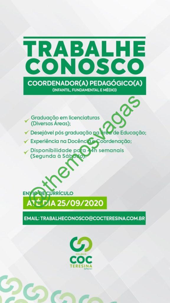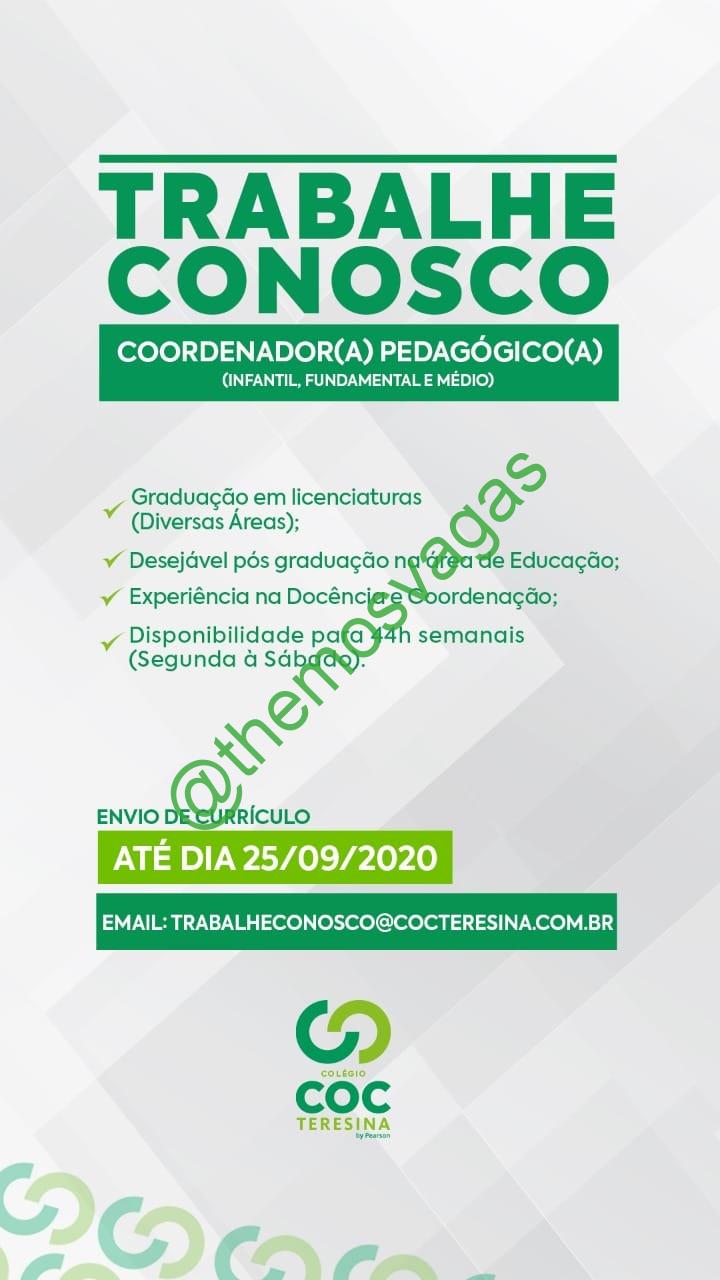 – Interessados(as) e que atendam ao perfil solicitado acima, devem enviar o currículo até 25/09/2020 para o e-mail trabalheconosco@cocteresina.com.br contendo no título/assunto “Coordenador Pedagógico THE