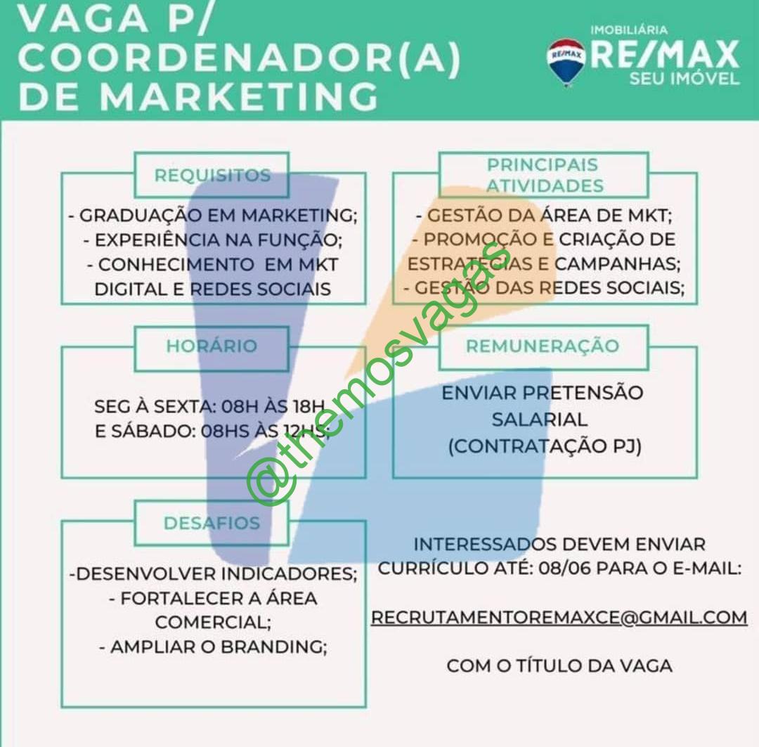 – Interessados(as) e que atendam ao perfil solicitado acima, devem enviar o currículo para o e-mail recrutamentoremaxce@gmail.com, contendo no titulo/assunto “Coordenador(a) de Marketing – FOR