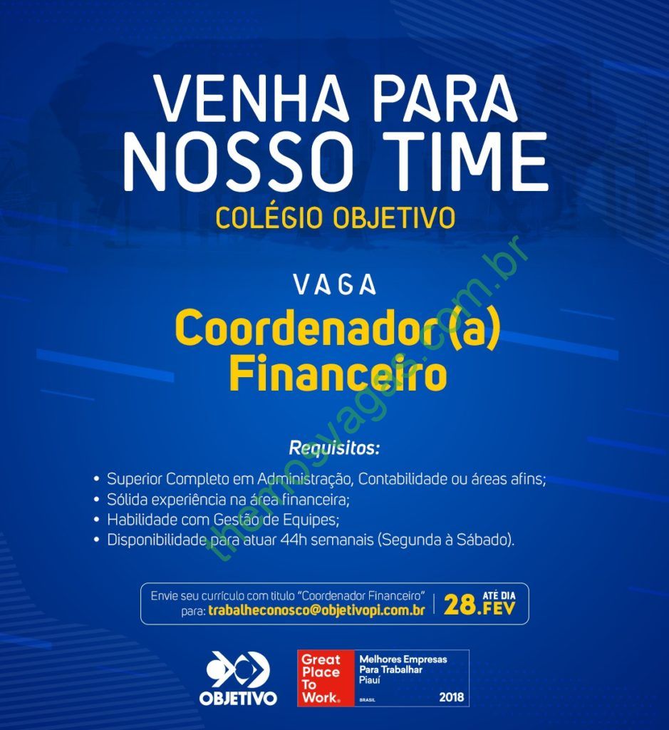 Interessados(as) e que atendam aos requisitos devem enviar o perfil profissional até o dia 28/02/2019, colocando no título do e-mail “Coordenador(a) Financeiro “, para:  trabalheconosco@objetivopi.com.br