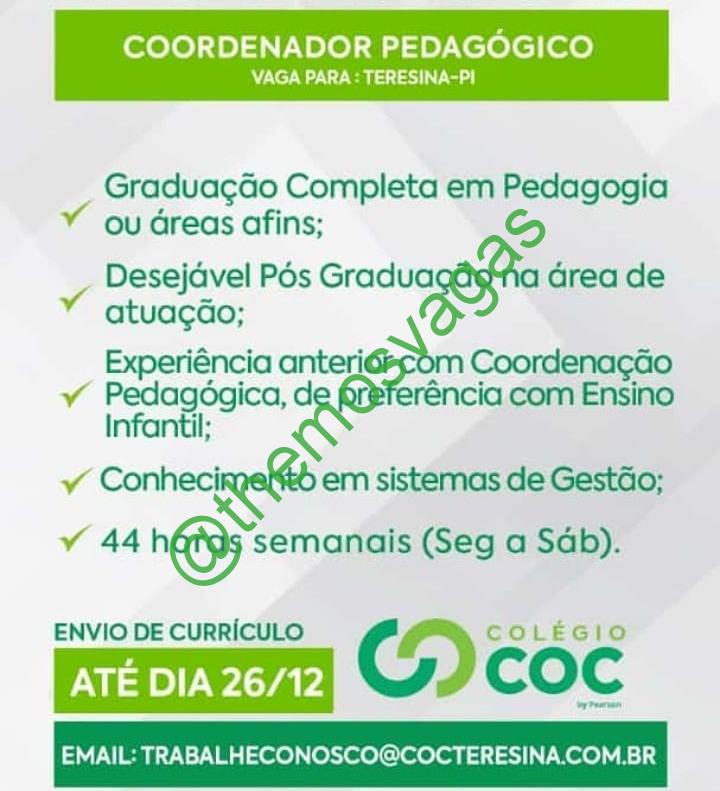 – Interessados(as) e que atendam ao perfil solicitado acima, devem enviar o currículo até o dia 26/12/2019 para o e-mail trabalheconosco@cocteresina.com.br , colocando no título/assunto “Coordenador(a) Pedagógico THE”.