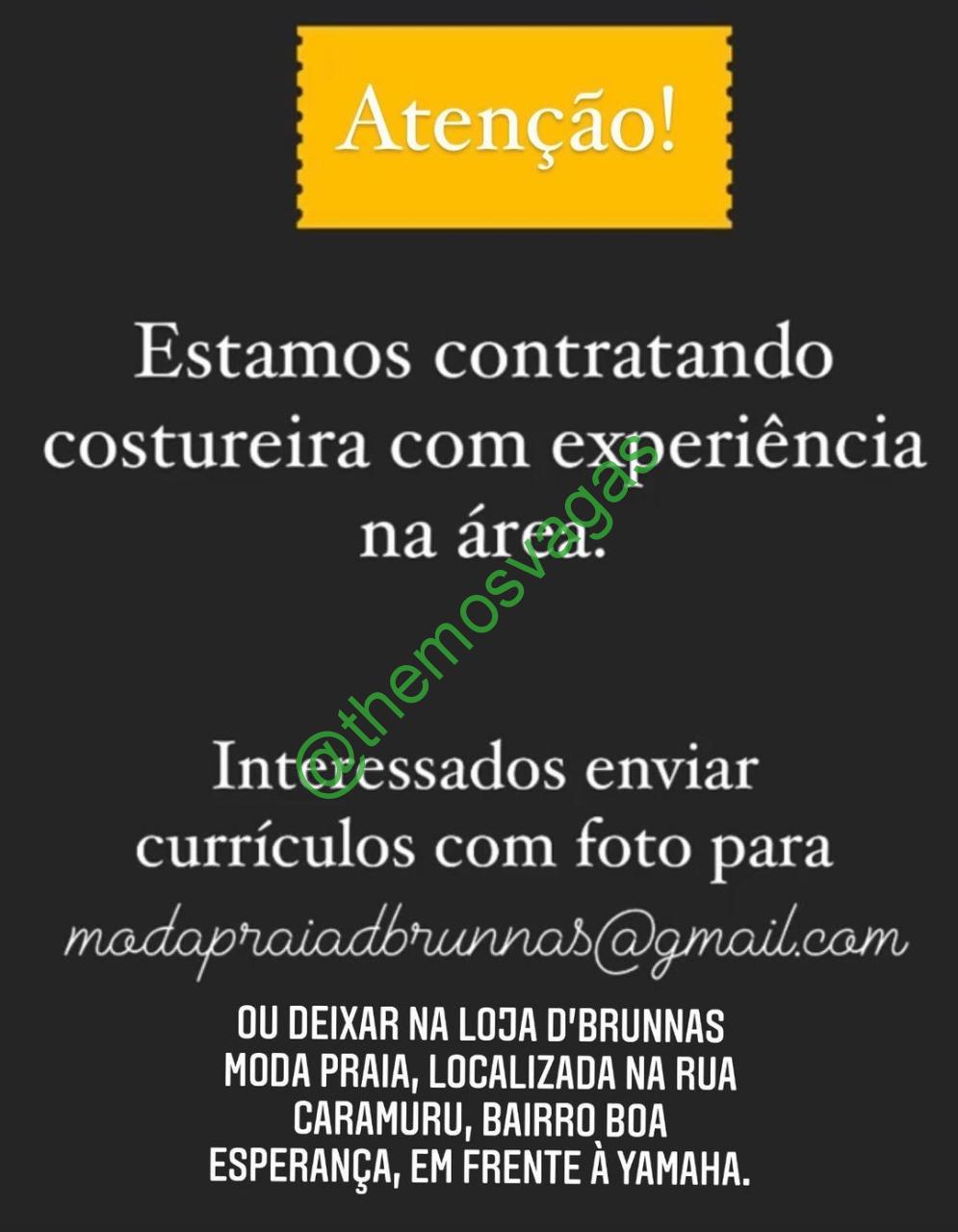 – Interessados(as) e que atendam ao perfil solicitado acima, devem enviar o currículo para o e-mail modapraiadbrunnas@gmail.com , contendo no título/assunto “Costureira – PHB” ou entregar o currículo na Loja D’Brunnas Moda Praia na Rua Caramuru, Bairro Boa esperança, em frente à Yamaha, Parnaíba/PI.