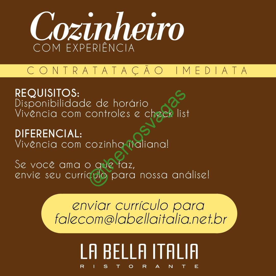 – Interessados(as) e que atendam ao perfil solicitado acima, devem enviar o currículo para o e-mail falecom@labellaitalia.net.br, contendo no título/assunto “CozinheiroFOR”.
