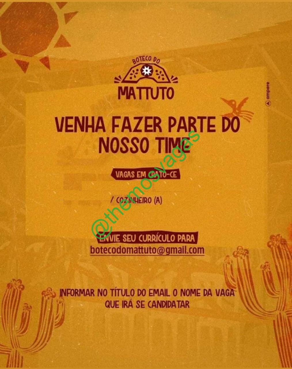 – Interessados(as) e que atendam ao perfil solicitado acima, devem enviar o currículo para o e-mail botecodomattuto@gmail.com, contendo no título/assunto “Cozinheiro – Crato“.