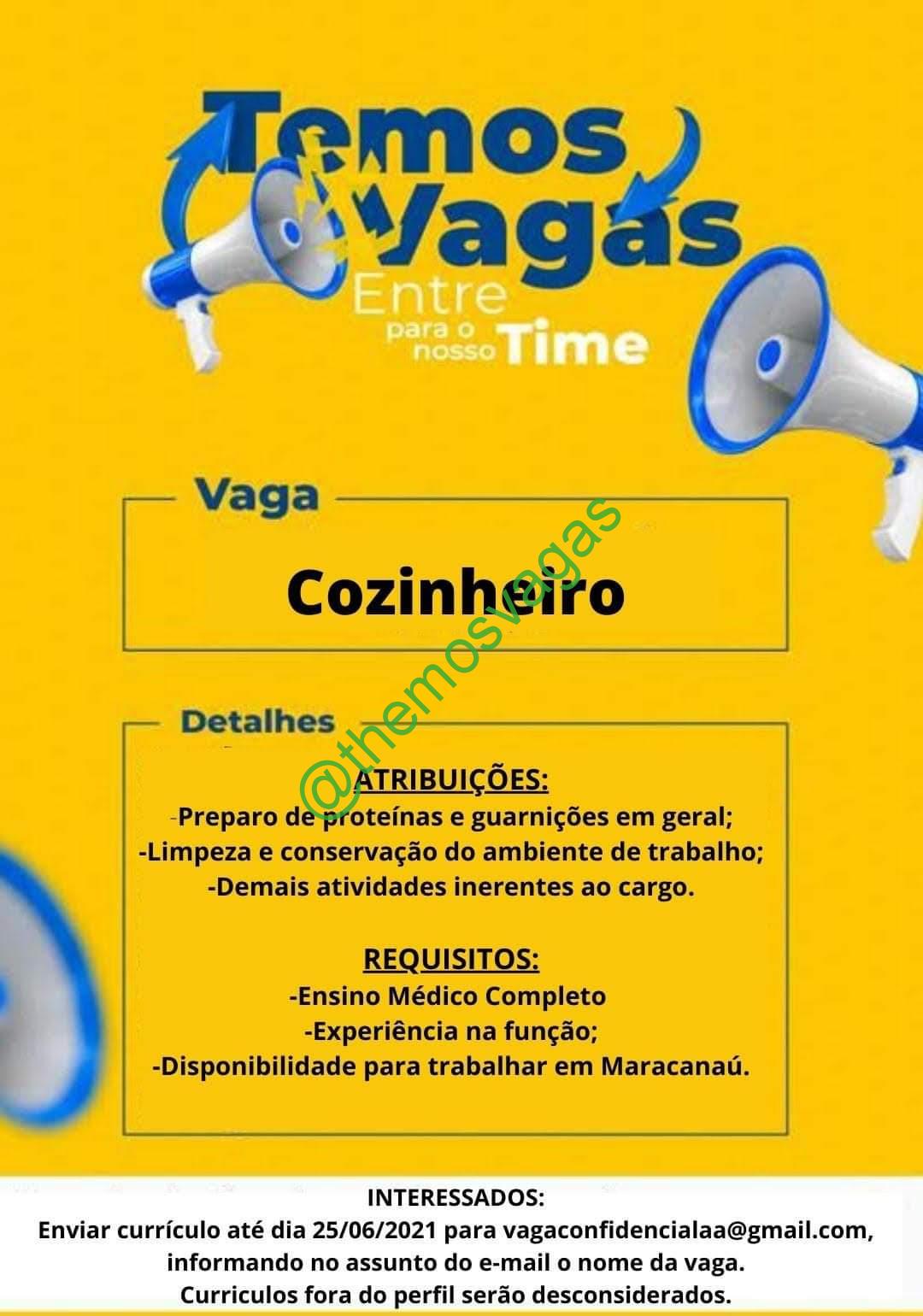 – Interessados(as) e que atendam ao perfil solicitado acima, devem enviar o currículo até 25/06/2021  para o e-mail vagaconfidencialaa@gmail.com, contendo no titulo/assunto “Cozinheiro – FOR”.