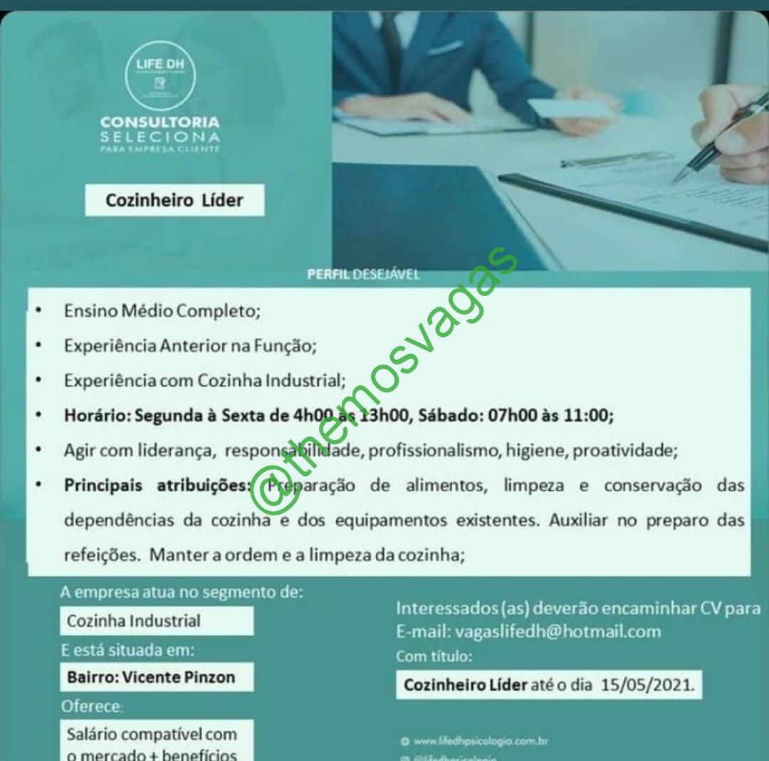 – Interessados(as) e que atendam ao perfil solicitado acima, devem enviar o currículo até 15|05|2021 para o e-mail vagaslifedh@hotmail.com, contendo no título/assunto “Cozinheiro Líder – FOR”.